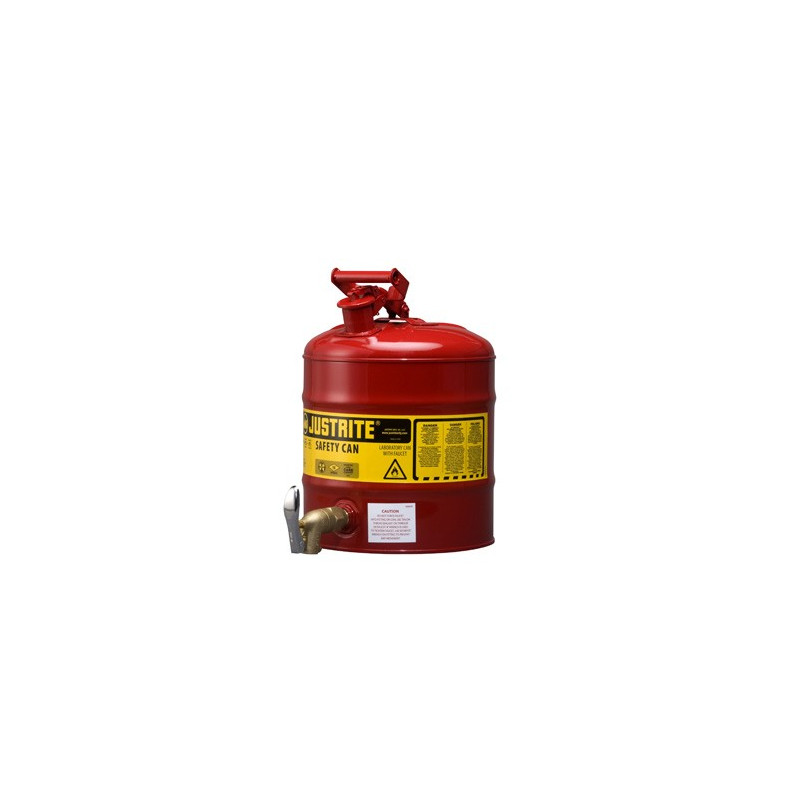 Justrite's Steel Laboratory Safety Cans have all the benefits of the Type I cans. Model no. 7150150Z 19 Litre capacity. Added features make these the choice of lab professionals for safely dispensing hazardous liquids into test tubes, small flasks and beakers. Fill spouts have self-close, pressure-relief caps and stainless steel flame arresters. These cans also feature a vacuum-relief valve within the lid for smooth liquid flow, and self-closing faucets for trouble-free dispensing. Fitted with the No. 08902 tap which is better suited for heavy, industrial use.